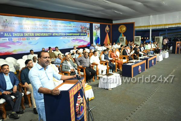 ಮೂಡುಬಿದಿರೆ, ಜ. 13 (DaijiworldNews/TA): ಆಳ್ವಾಸ್ ಶಿಕ್ಷಣ ಪ್ರತಿಷ್ಠಾನವು ರಾಜೀವ್ ಗಾಂಧಿ ಆರೋಗ್ಯ ವಿಜ್ಞಾನಗಳ ವಿಶ್ವವಿದ್ಯಾಲಯದ ಸಹಯೋಗದಲ್ಲಿ ಇಲ್ಲಿನ ಸ್ವರಾಜ್ ಮೈದಾನದಲ್ಲಿ ಹಮ್ಮಿಕೊಂಡ ಐದು ದಿನಗಳ ‘85ನೇ ಅಖಿಲ ಭಾರತ ಅಂತರ ವಿಶ್ವವಿದ್ಯಾಲಯ ಅಥ್ಲೆಟಿಕ್ಸ್ ಚಾಂಪಿಯನ್ಶಿಪ್ 2025-26’ ಸೋಮವಾರ ಅಚ್ಚುಕಟ್ಟಾದ ಮೂಲಸೌಕರ್ಯ, ತಾಂತ್ರಿಕ ನಿಖರತೆ, ಸಮಯ ನಿರ್ವಹಣೆ, ಆತಿಥ್ಯ ವ್ಯವಸ್ಥೆಗಳ, ಶಿಸ್ತುಬದ್ಧತೆ, ಅದ್ಧೂರಿ ಮೆರವಣಿಗೆಗಳ ಜೊತೆ ಆರಂಭಗೊಂಡಿತು.