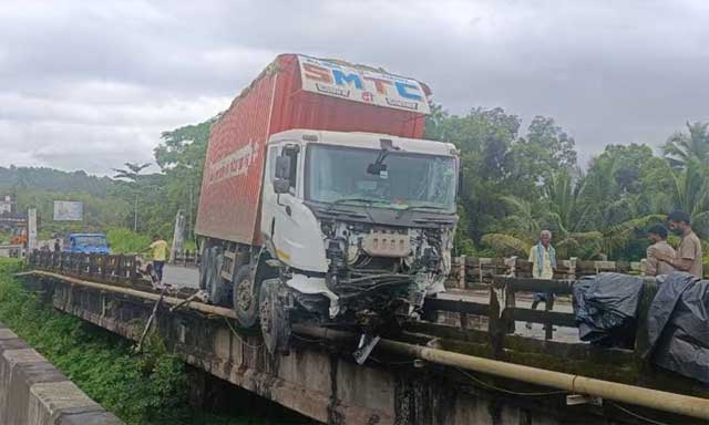 Byndoor, Oct 3: A major mishap was averted after a container lorry rammed into a bridge at Khambadakone on National Highway 66 on October 2.