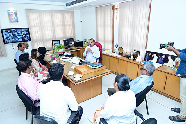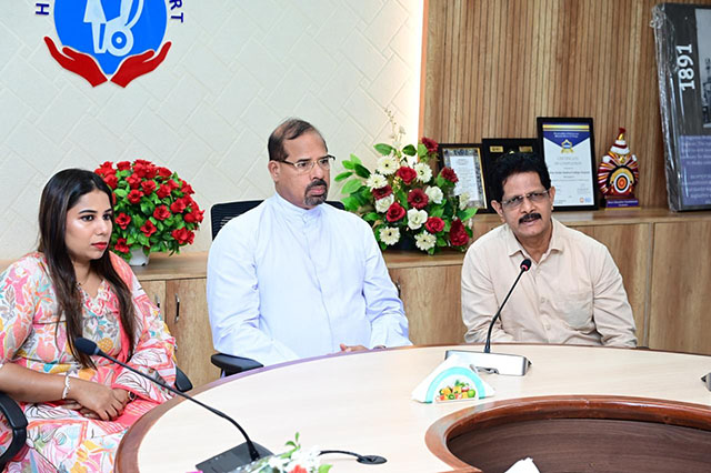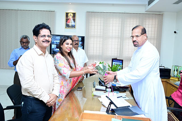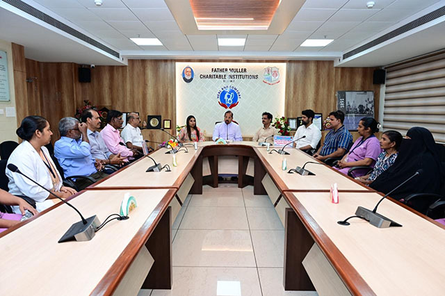 Mangaluru, Oct 4: The trustees of G Shanker Trust, led by Shamili, daughter of Nadoja G Shanker, visited Father Muller Charitable Institutions (FMCI) on October 4 to extend healthcare aid to patients suffering from cancer and kidney ailments. The delegation was warmly received by Fr Faustine Lucas Lobo, director of FMCI, who offered his blessings and appreciation for the Trust’s benevolent service to humanity.