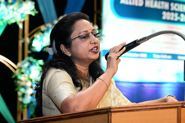 Dr Sunita Saldanha, allied & healthcare professions, Yenepoya (Deemed to be University), Mangaluru, graced the occasion as the chief guest. In her address, Dr Saldanha expressed her happiness and pride in being part of the event and thanked the institution for the invitation. She shared her experiences as a healthcare professional and narrated inspiring stories about her students. Emphasizing the value of dedication in the medical field, she remarked that healthcare is not merely a job but a continuous research and learning process. She congratulated the students for choosing the right profession at the right time and praised Father Muller College as one of the best institutions for healthcare education.