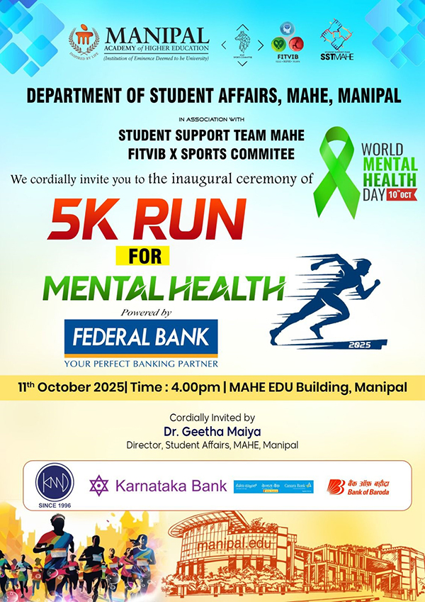 Udupi, Oct 8: The department of student affairs MAHE Manipal, MAHE Manipal, In Association with KMC Sports Committee, FIT VIB KMC MAHE Manipal and Student Support team MAHE Manipal is set to organize the Mental Health Awareness Run 2025, a 5K Run for Mental Health, on Saturday, October 11, as part of MAHE's Mental Health Awareness Week (October 5-11).