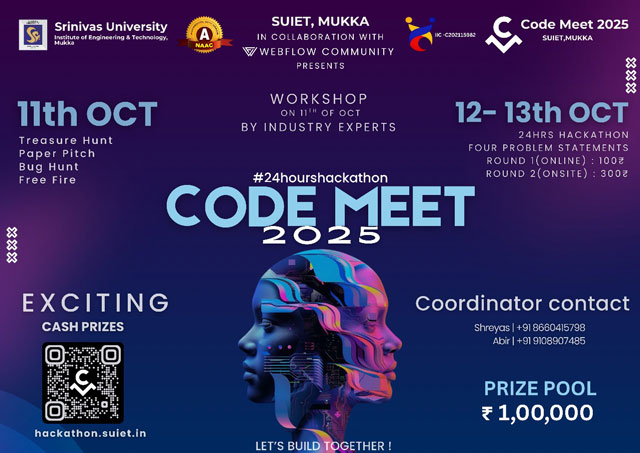 Mangaluru, Oct 9: Srinivas University Institute of Engineering & Technology, Mukka, is proud to present the third edition of CODE MEET, a dynamic and immersive national-level hackathon, in collaboration with the WebFlow Community. The 3-day event will be organised on October 11, 12 and 13. This three-days technical extravaganza is designed to foster innovation, collaboration, and skill development among students, tech enthusiasts, and industry professionals.