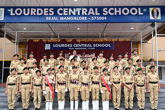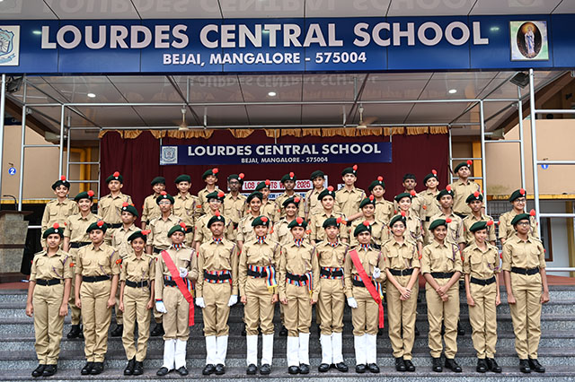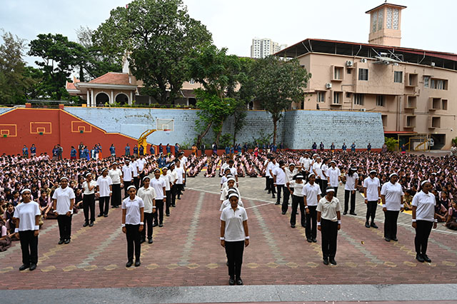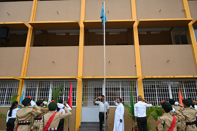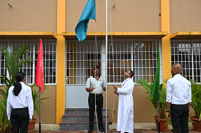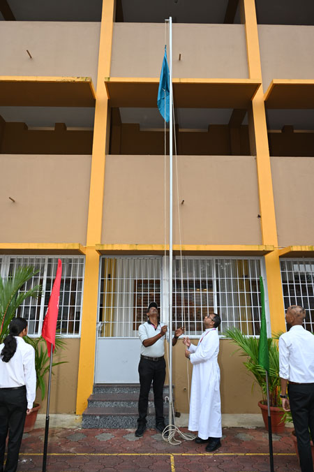 Accompanying them were the esteemed dignitaries: Fr Johnson L Sequeira, the principal, Anitha Thomas, the vice principal, Fr Arul Joseph, Veerendra Alva, and the sports ministers Shreyas Bhat of class XIIB and Ania Mascarenhas of class XD, escorted respectfully by the physical education teacher Vishwanath Devadiga, as they proceeded to the flag post. The principal Fr Johnson L Sequeira hoisted the flag followed by the singing of the School Anthem.