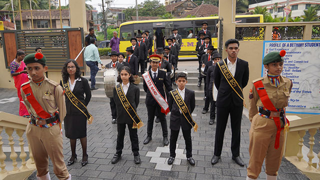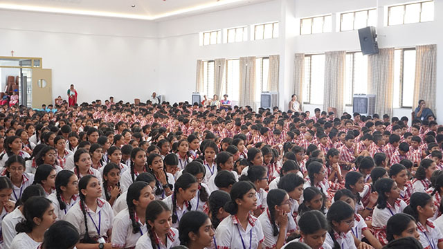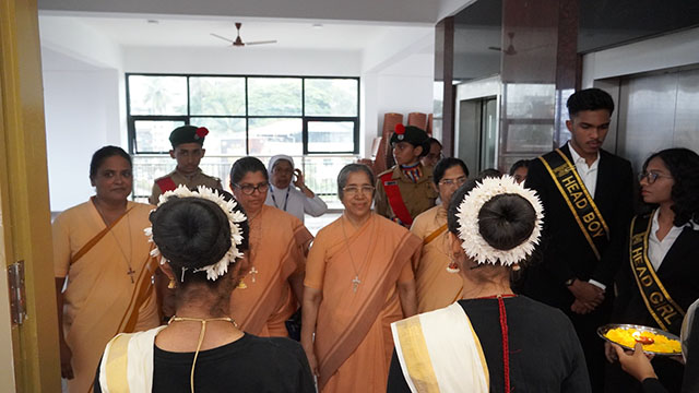 The distinguished guests were accorded a grand welcome with a guard of honour by the school band, followed by a traditional Mangalurean welcome featuring aarathi, kalasha, garlands, beetel leaves, rose petals, and rose water — symbols of love, reverence, and cultural richness. They were escorted to the dais by principal Sr Lourdes, vice principal Sr Vidya, and the school leaders.