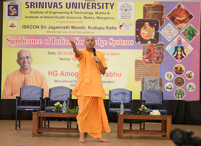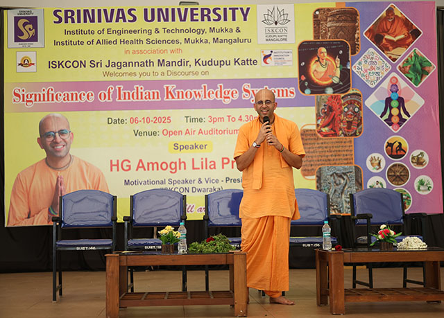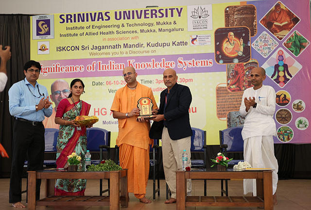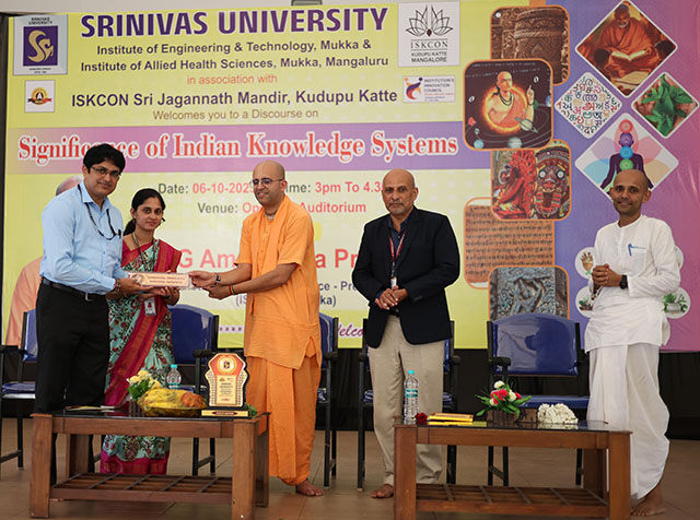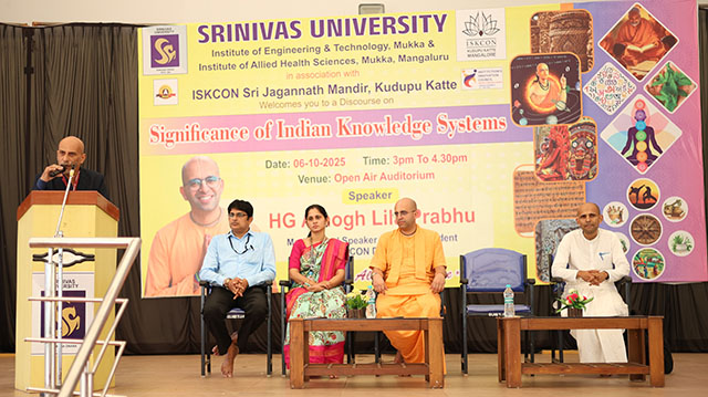 Mangaluru, Oct 11: Srinivas University Institute of Engineering and Technology (SUIET) Mukka and Srinivas University Institute of Allied Health Sciences (SIAHS) in collaboration with ISKCON Sri Jagannath Mandir, Kudupu Katte, organised a discourse on Indian knowledge systems at the SUIET Mukka Campus.