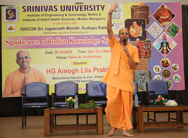 The programme commenced with a welcome and keynote address by Dr Ramakrishna N Hegde (dean, SUIET Mukka). Convenor of the programme Prof Shrinath Rao K introduced the chief guest and resource person Amogh Lila Das Prabhu Ji and Dr Vanamali Govind Das Ji. Prof Rohan Fernandes served as the master of ceremonies and delivered the vote of thanks. The invocation was performed by Sumanth Shrikanth Bhat. Prasadam was distributed to all attendees at the conclusion of the event.