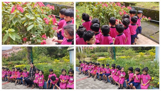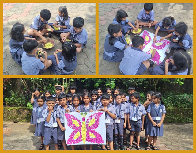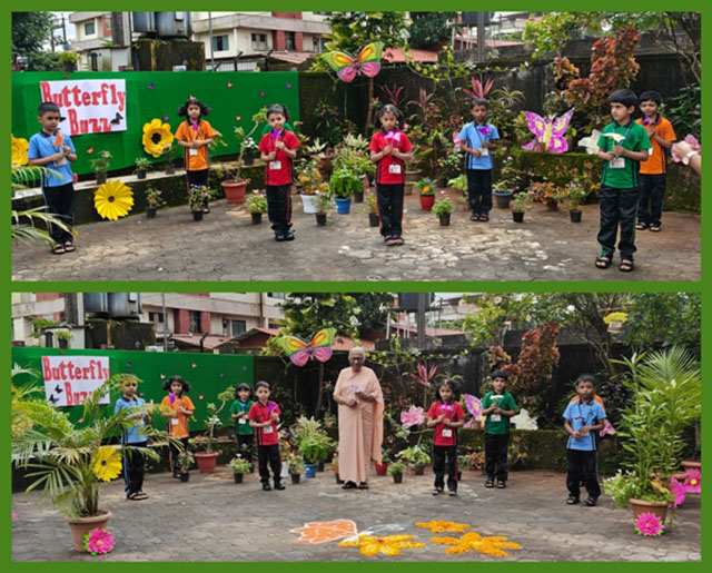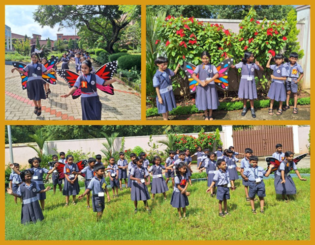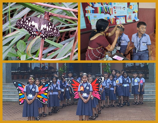The UKG students created a hanging garden using recycled plastic bottles, promoting sustainability and teamwork. Students from grade I enjoyed the “Butterfly Buzz” activity, with butterfly face painting, watching real butterflies, and creating colourful collages.