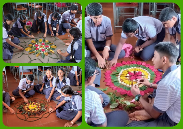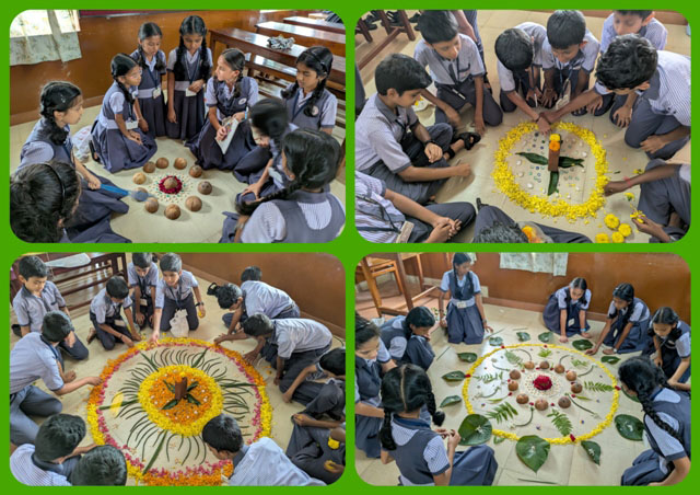 The Carmel blossoms visited Maxim Rodrigues’ organic farm, learning sustainable farming practices. The NCC, scouts and guides led a cleanliness drive to the nearby Helipad and created rangolis with natural materials. Through these activities, the students celebrated creation, practiced sustainability, and pledged to be true guardians of our common home.