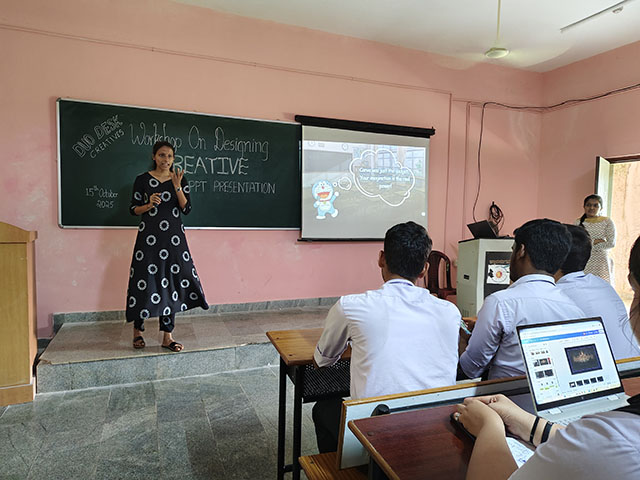 The resource persons provided valuable insights on enhancing presentation design through innovative layouts, visual storytelling, and effective use of colour and typography. The workshop aimed to help students create professional and engaging PowerPoint presentations using CANVA which are most suitable for academic and professional contexts. A total of 46 participants actively engaged in the hands-on session, learning various design techniques and presentation tools.