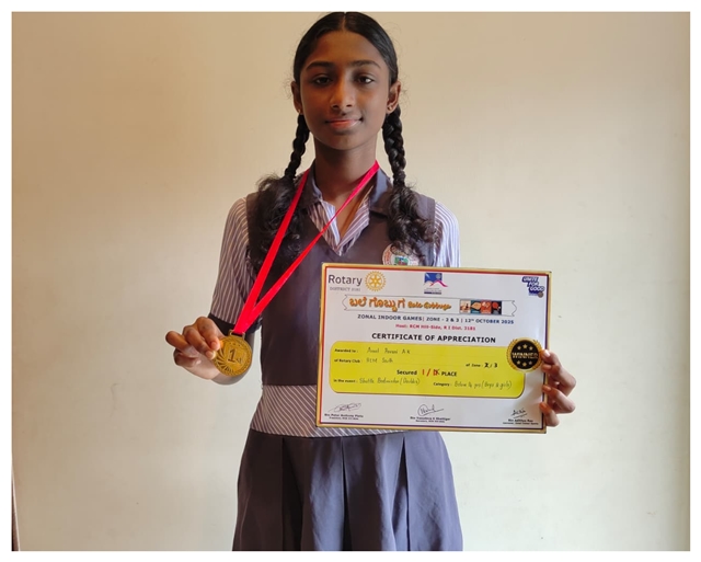 In the Zonal Indoor Games organised by Rotary Club Hill Side, which was held on October 12, Pavani Anil Kumar of grade IX D secured 1st place in Shuttle Badminton (Doubles) in the U-14 category.