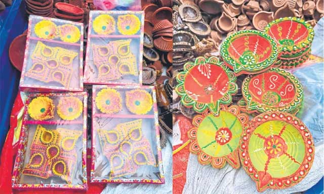 Traditionally, clay diyas are used for home decoration during Deepavali. They are lined up on tulsi platforms, staircases, and windows, illuminating homes with their soft glow. This year, a wide range of clay diyas has arrived in the market. Prices start at Rs 3 per diya and go up to around Rs 40 per dozen, while some intricately designed ones are priced above Rs 100.