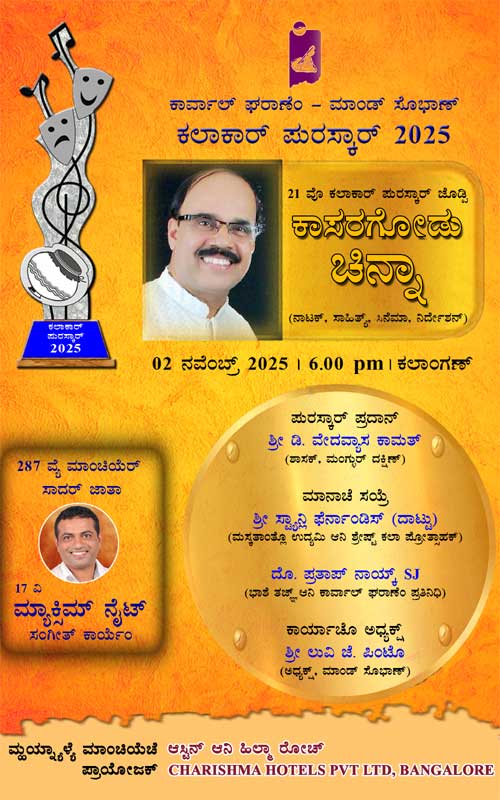 The Kalakar Puraskar was established in 2005 in the name of the Carvalho family, in association with Mandd Sobhann, to honour Konkani artistes. To date, the award has been presented to Arun Raj Rodrigues (Drama), Joel Pereira (Music), Harry D’Souza (Brass Band), Fr Charles Vas (Devotional Music), Anuradha Dhareshwar (Music), Sant Bhadragiri Achyutadas (Harikatha), James Lopes (Brass Band), Norbert Gonsalves (Music), Francis Fernandes Cassia (Drama), Roshan D’Souza (Music), Christopher D’Souza (Drama), Avil D’Cruz (Dance), M Gopala Gowda (Folk Art), Dolla Mangaluru (Drama), Irene Rebello (Wedding ‘Sobhane’ Songs), Anita D’Souza (Singing), Nihal Tauro (Singing), Melvyn Peris (Music), Apolinaris D’Souza (Singing) and Roshan Bela (Music).