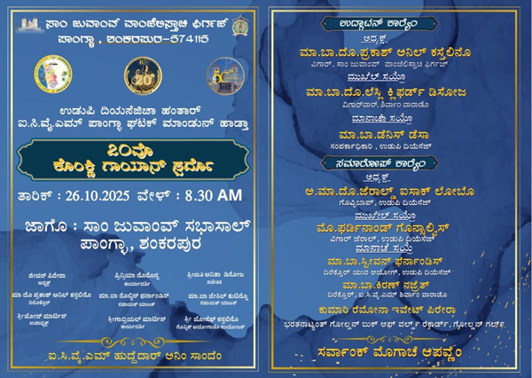 Udupi, Oct 23: The ICYM Pangla Unit, in association with St John the Evangelist Church, Pangla–Shankerpura, is all set to host the 20th Udupi Diocese-level Konkani singing competition on October 26 at 8:30 am in the Pangla Church Hall. This much-awaited annual event has been a key platform for nurturing and celebrating Konkani musical talent across the diocese.