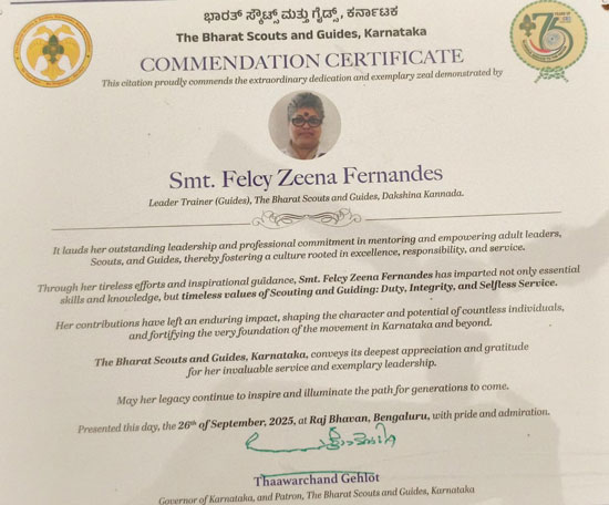Mangaluru, Oct 24: Felcy Zeena Fernandes, a beacon of inspiration, has been honoured for her outstanding leadership and selfless service in empowering adult leaders, scouts, and guides. Recognized by respected Thaawarchand Gehlot, governor of Karnataka, on September 26, for fostering a culture of excellence, responsibility, and service at Raj Bhavan, Bengaluru.