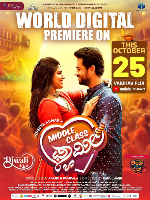 Mangaluru, Oct 24: Bringing festive cheer to Tulu cinema fans, the team of ‘Middle Class Family’ has announced a special Diwali gift — the world digital premiere of the film, starring Tulu stars Vineeth Kumar and Samatha Amin, who recently tied the knot.
