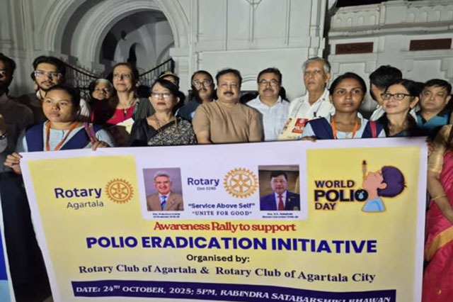 Agartala, Oct 25: A rally to spread awareness on polio eradication was held in Agartala on Friday, beginning from Rabindra Satabarshiki Bhavan and concluding at the Ujjayanta Palace, covering major routes across the city.