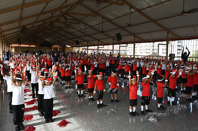 Linette Pereira, the co-ordinator of kindergarten welcomed the gathering which was followed by flag bearing ceremony. The students Laukik, Jianna, Anam and Steven carried the house colour flags with Malini.