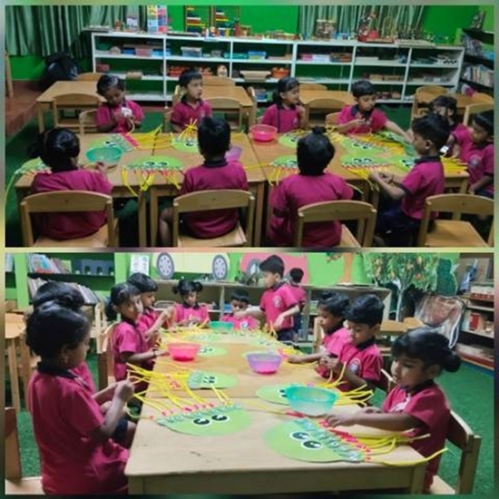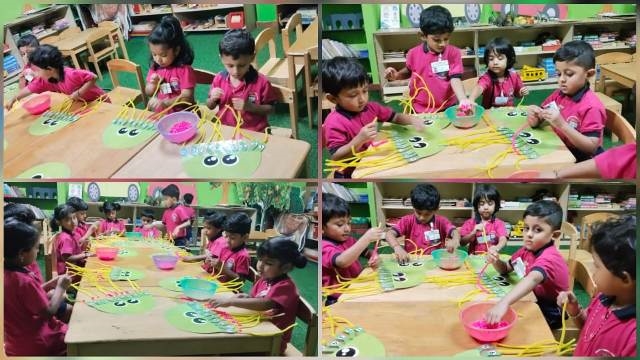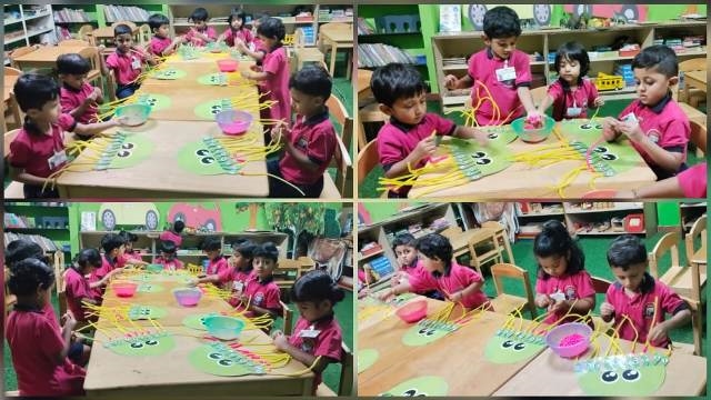 Threading colourful beads kept their little hands busy, helping them strengthen fine motor skills and improve hand-eye coordination. Their curiosity and enthusiasm made the activity even more delightful.