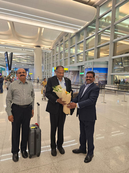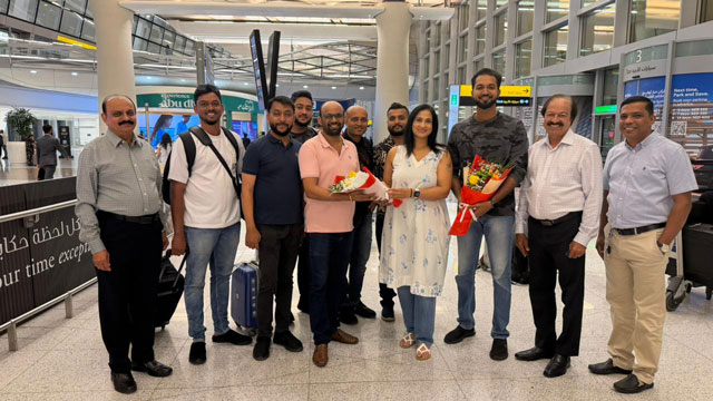 Abu Dhabi, Nov 7: Dr Peter Paul Saldanha, Bishop of Mangalore Diocese and chief guest for the Konkani Cultural Organization (KCO) Pearl Jubilee Celebrations, arrived in Abu Dhabi on Thursday. He was warmly welcomed by Leo Rodrigues, president of KCO, and Franklin D’Cunha, convenor of the Pearl Jubilee Celebrations. Also present to greet him were Dolphy Vas and Jason Correa, Advisors of KCO.