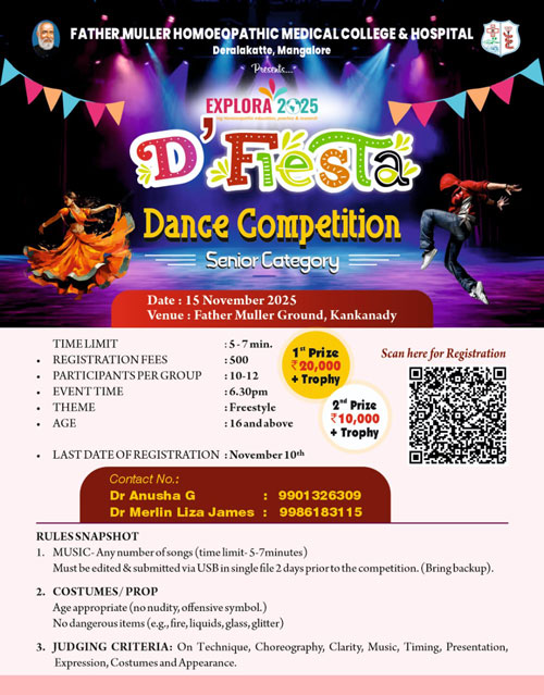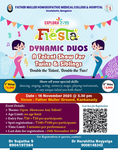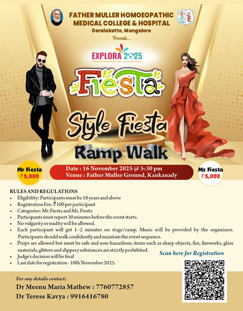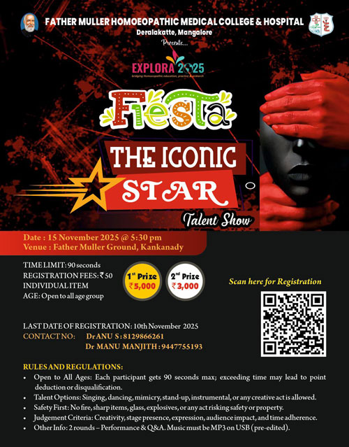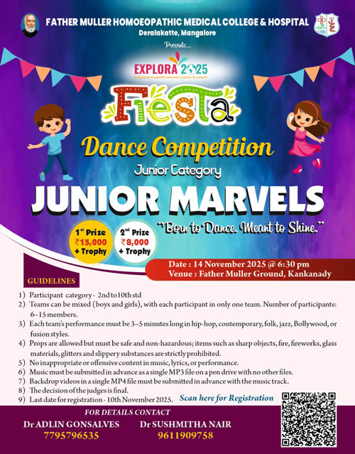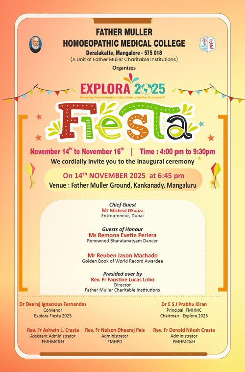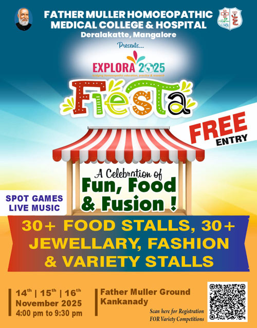 Mangaluru, Nov 12: Adding colour and vibrancy to the conference week, Father Muller Homoeopathic Medical College and Hospital (FMHMC&H) has announced Explora Fiesta 2025, a three-day cultural and public festival to be held from November 14 to 16, between 4:30 pm and 9 pm at the Father Muller Grounds, Kankanady.