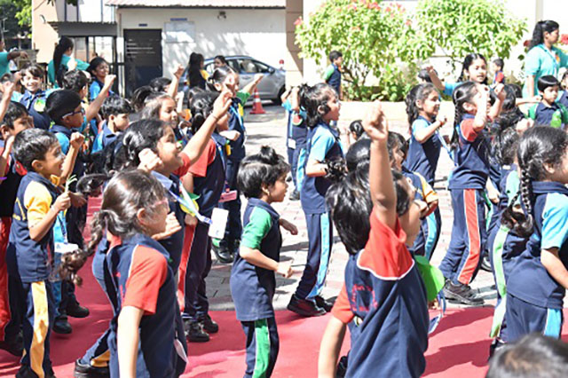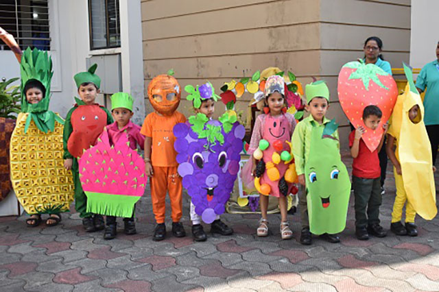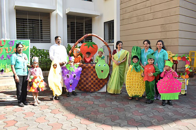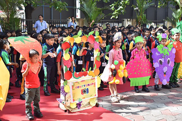 The programme began with a melodious prayer song, followed by a warm welcome address by Hithaishi Datt of KG–II A. The significance of bagless day was shared by Thanvika Narendiran and Shaivi Shailesh Rai of KG–II B, while Fathima Inara of KG–II C spoke on the theme 'Fruity Fun Land', celebrating health, nutrition, and the joy of fruits.