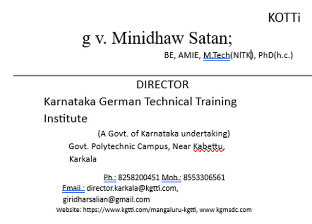 He is an Alumnus of NITK Surathkal, presently working as the Director Karnataka German Technical Training Institute KGTTI, Mangaluru and Karkala.