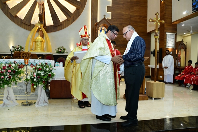The main sponsors, donors who contributed materials, and all benefactors who donated Rs 1 lac and above were felicitated by Bishop Robert with a St Lawrence memento as a token of gratitude and love. Bishop Robert Miranda himself was felicitated by the parish clergy, the vice president, and the secretary of the PPC with a shawl, memento, fruits, and a flower bouquet.