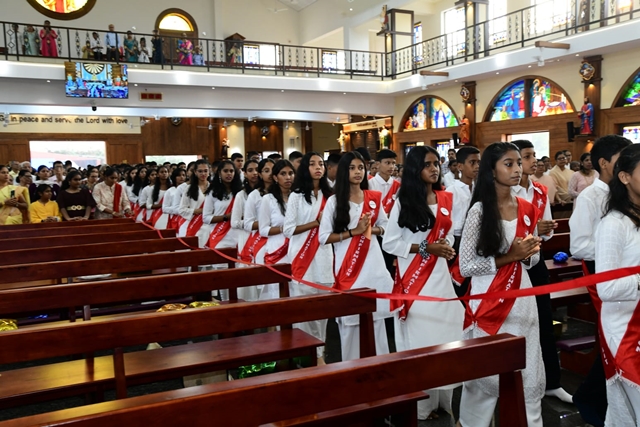 Sr Jennifer, the catechism teacher who prepared the children for the sacrament, called upon all the newly confirmed candidates. Bishop Dr Robert then handed over the confirmation certificates and a rosary to each child. The boys holding white balloons and the girls holding yellow balloons stood on the stage and released them into the air, followed by the release of white pigeons as a symbol of peace. The children then sang the thanksgiving hymn, joined by the parish clergy, vice president John D’Silva, and secretary Santhosh Misquith of the parish pastoral council.