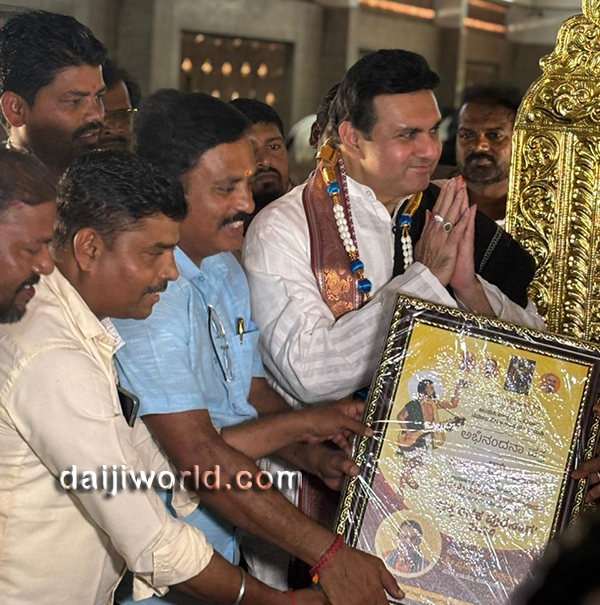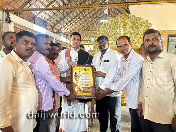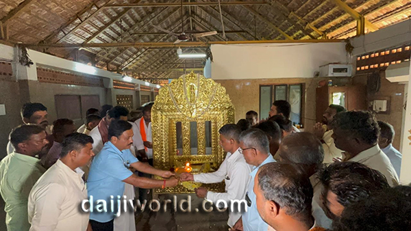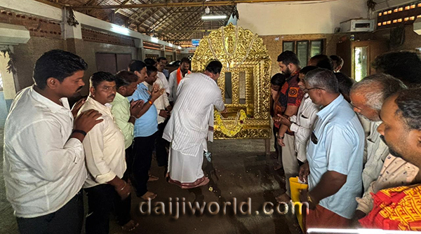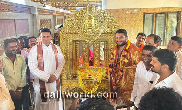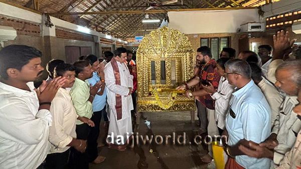 The Kanaka Kavacha, sculpted under the leadership of Vivek R Prabhu of Gurupura Kaikamba at Sri Damodar Jewellers, was handed over to Pramod Madhwaraj. The intricate design depicting Sri Krishna and Kanakadasa on the Kavacha has drawn widespread admiration.