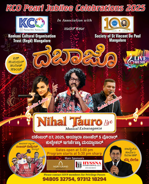 Mangaluru, Nov 25: The countdown has begun for KCO's Pearl Jubilee Celebrations “Dabazo” Nihal Tauro Live show scheduled for Sunday, December 7, 2025, at Kulashekar Church grounds. The event is organised by Konkani Cultural Organization Trust (Regd), Mangaluru, in association with the Society of St Vincent de Paul (SSVP), Mangaluru.