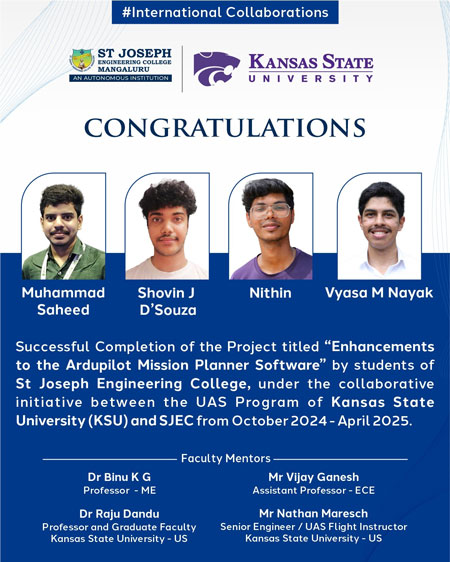 Mangaluru, Nov 25: St Joseph Engineering College (SJEC), Mangaluru, proudly announces the successful completion of an international collaborative project titled “Enhancements to the Ardupilot Mission Planner Software.” The project was undertaken by four students of the college, Muhammad Saheed, Shovin J D’Souza, Nithin, and Vyasa M Nayak as part of the ongoing partnership between the UAS programme of Kansas State University (KSU), USA, and SJEC.