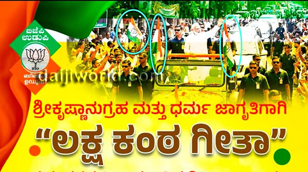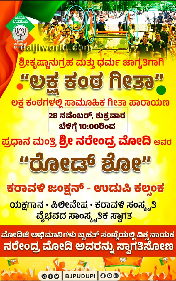Udupi, Nov 25: A poster announcing Prime Minister Narendra Modi’s upcoming visit to Udupi and the planned road show by the Udupi district BJP has stirred debate after it was found carrying the Congress party flag in the background.
