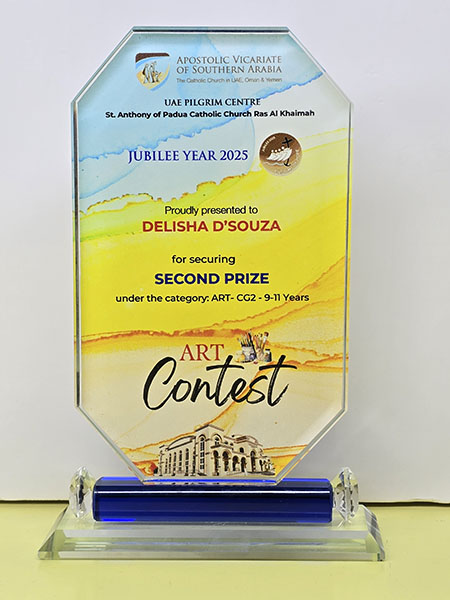 The award ceremony was held on November 23 at the church premises. Delisha competed with participants from Catholic churches across the UAE and was recognised for her remarkable creativity and vision. She was awarded a cash prize of AED 750 along with a memento.
