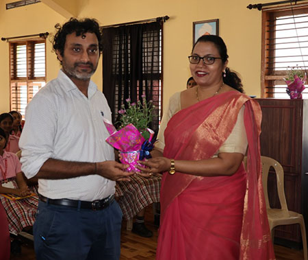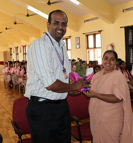 The programme began with a prayer, invoking God’s blessings for a meaningful and enlightening session. Daphny then extended a gracious welcome, highlighting the importance of timely guidance in making informed academic choices. As a gesture of respect and appreciation, the resource persons Ashwin, HOD of the physics department, and Mathew Anthony, HOD of the commerce department were presented with potted plants by vice principal Sr Meena Fernandes AC and Josephine, symbolising growth and learning.