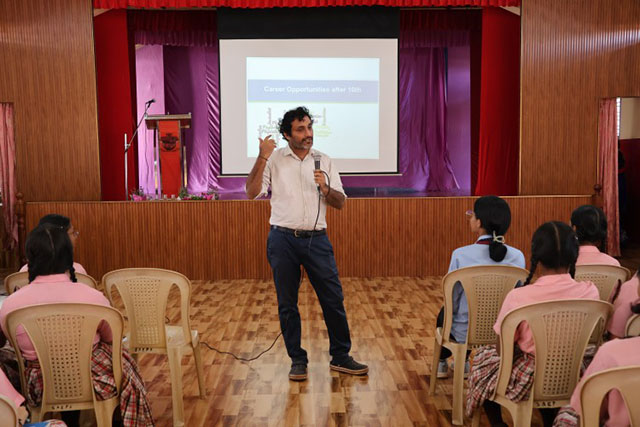 Ashwin provided an insightful overview of the science stream and its wide-ranging career prospects. He explained the various subject combinations at the PU level, medical-related fields and the discipline required to excel in entrance examinations. He emphasised purposeful learning, outlined different categories of colleges, and guided students on choosing institutions based on credibility and long-term opportunities. He also introduced students to emerging high-demand careers and well-paid professional avenues, urging them to stay aware of the rapidly evolving career landscape.
