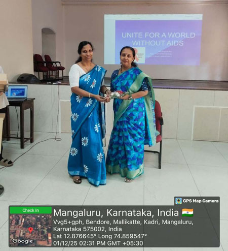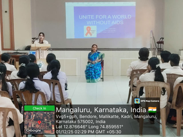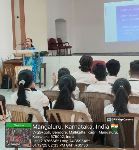 The resource person for the session was Prajwal Rao, HoD and assistant professor, Department of Microbiology, St Agnes College (Autonomous), Mangaluru. She delivered an informative and insightful talk on HIV transmission, prevention methods, myths and facts, and the importance of building a supportive and inclusive environment for people living with HIV. Her session helped students understand the scientific, social, and emotional aspects of HIV/AIDS.