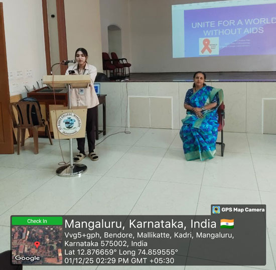 Mangaluru, Dec 5: The Youth Red Cross Unit of St Agnes College (Autonomous), Mangaluru, organised an awareness session on the occasion of World AIDS Day on December 1 on the topic “Unite for a World Without AIDS.” The session began in the Room No A4, Avila Block.