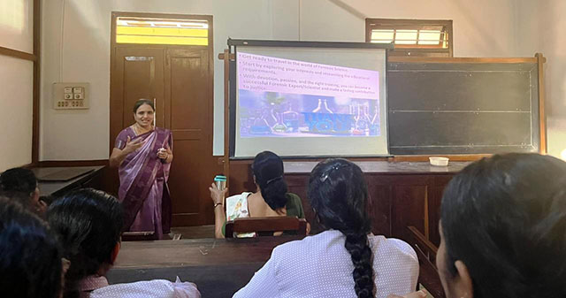 Dr Saritha introduced forensic science as the application of natural sciences in crime investigation and legal justice, explaining how chemistry, biology, and physics concepts analyze evidence via DNA fingerprinting, chromatography, and mass spectrometry. She covered major branches forensic psychology, forensic entomology, forensic toxicology, fingerprint analysis, and odontology and highlighted its role in crime-solving, unbiased evidence, disaster-victim identification, cybersecurity, counter-terrorism, and public safety.