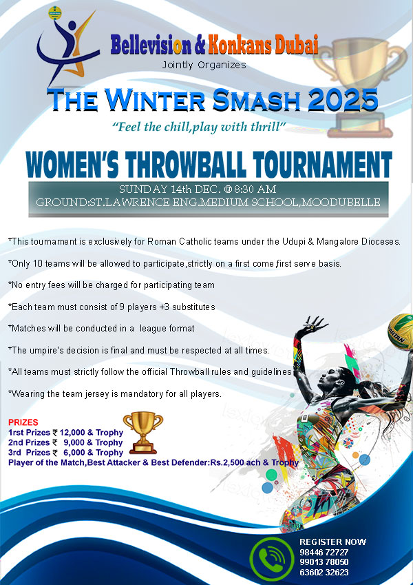 Udupi, Dec 09: Bellevision and Konkans Dubai jointly organizes 'The Winter Smash 2025', an exciting women’s throwball tournament set to take place on Sunday, December 14, at 8.30 am. The event will be hosted at the grounds of St Lawrence English Medium School, Moodubelle.