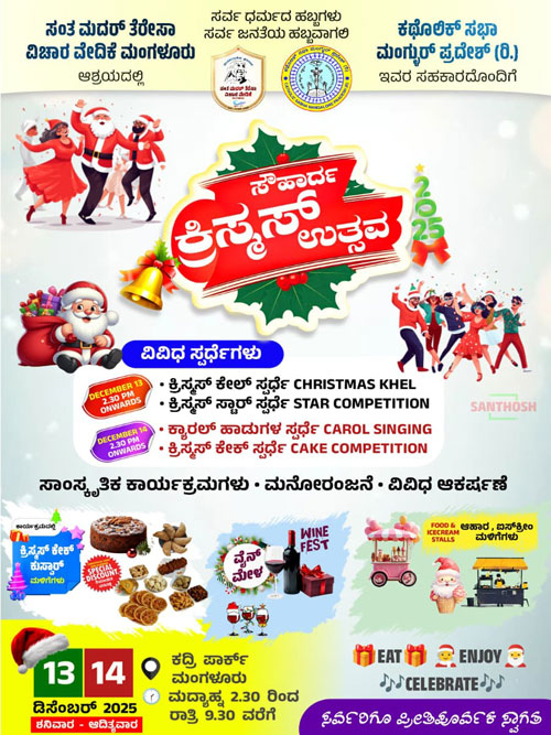 Mangaluru, Dec 9: St Mother Teresa Vichara Vedike, Mangaluru, in collaboration with Catholic Sabha Mangalore Pradesh (R), will present the much-awaited 'Souharda Christmas Utsav 2025', a colourful and vibrant celebration that promotes peace, harmony, and the universal joy of Christmas. The two-day festival will take place on December 13 and 14, at Kadri Park, from 2:30 pm to 9:30 pm.