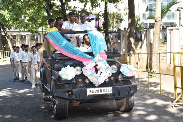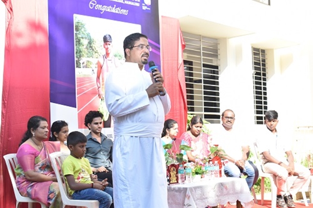 Yuvaraj was welcomed in a grand procession, arriving in an open jeep escorted by the physical education teachers. The celebration was held in the presence of the principal Fr Rohan D Almeida SJ, vice-principals, Yuvaraj’s proud parents Dheeraj Kotian and Veena D Kotian, and his coach, Bhakshith Salian from the Khelo India Centre, Mangaluru.