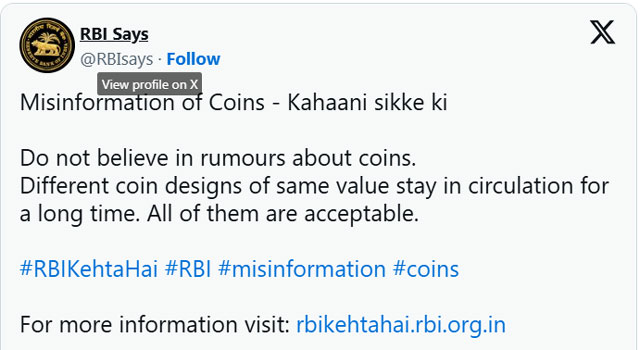 “Do not believe in rumours about coins. Different coin designs of the same value stay in circulation for a long time. All of them are acceptable,” the RBI stated.