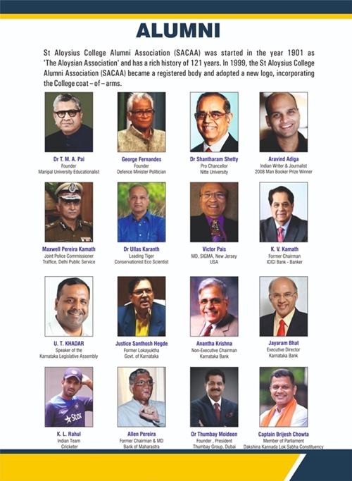 K S Hegde, former speaker of the Lok Sabha; Dr T M A Pai, founder of the Manipal Group, George Fernandes, eminent political leader; Justice Santhosh Hegde, former Lokayukta; K V Kamath, BRICS Bank chairman; Dr K V Rao, international physicist; K K Venugopal, the present attorney general; Aravind Adiga, Man Booker Prize winner; Anant Agarwal, CEO of edX; Dr K Ullas Karanth, leading conservation zoologist; K L Rahul, cricketer; are a few personalities among many others who have made a mark in public life exemplify the calibre of Aloysians who have left an indelible mark on society. Alongside these luminaries, thousands of graduates occupy key roles as entrepreneurs, CEOs, scientists, academicians and artists across continents. Its sustained engagement ensures that the strong bond between alumni and their alma mater continues to grow, inspiring current students and reinforcing the global Aloysian identity.