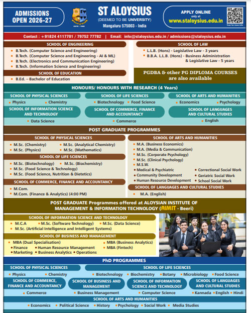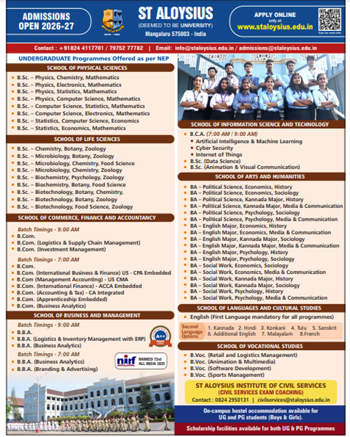As St Aloysius (Deemed to be University) moves confidently through its extraordinary 146-year legacy, it continues to uphold the Jesuit tradition of forming men and women for others who excel not only in knowledge, but in character, leadership and service. The university stands at the forefront of modern higher education with a forward-looking academic framework, cutting-edge infrastructure, strong industry collaborations and comprehensive student support systems that prepare learners for a rapidly evolving world. Rooted in a heritage that has shaped generations of thinkers, visionaries and changemakers, St Aloysius invites aspiring students to join a legacy that elevates intellectual curiosity, nurtures human excellence and inspires a lifelong commitment to serving society with purpose and compassion.