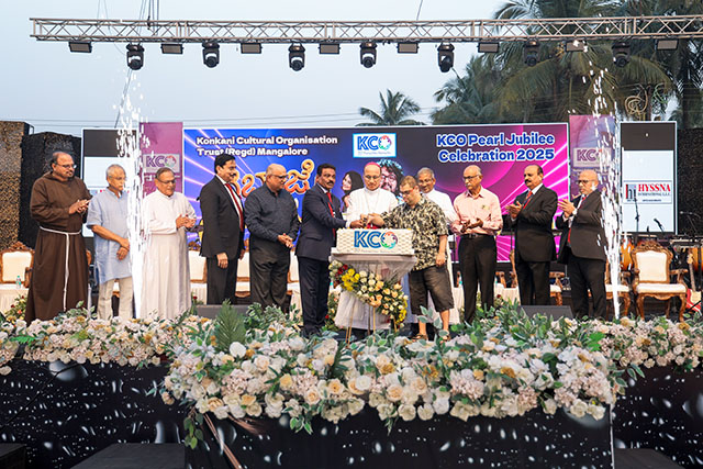 The founder president of KCO, Leo Rodrigues, extended a warm welcome to the attendees and provided a comprehensive overview of the organization's activities over the past three decades, highlighting its achievements and milestones. A symbolic Pearl Jubilee cake was then cut by Dr Gerald Lobo, bishop of Udupi, alongside Leo Rodrigues and other dignitaries present on stage, marking the beginning of a night that would be etched in the memories of the audience forever. The entire audience were served with snacks box.