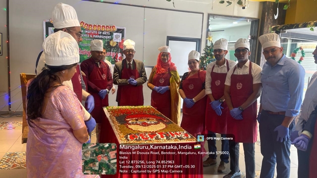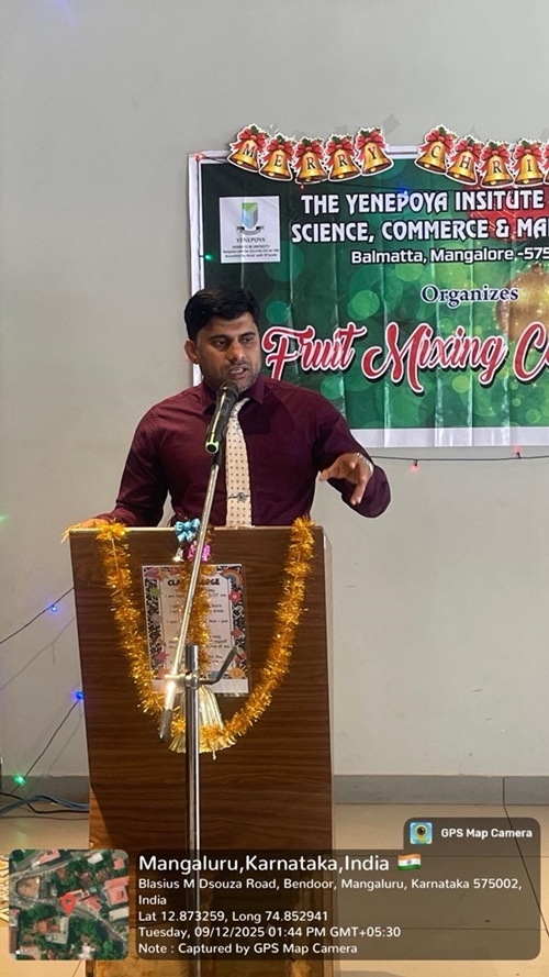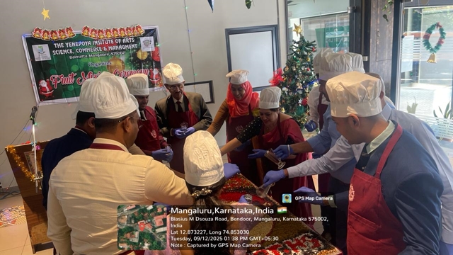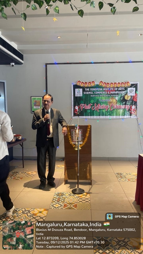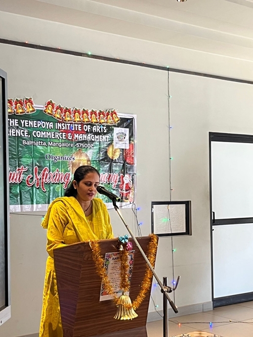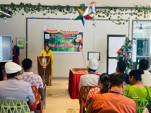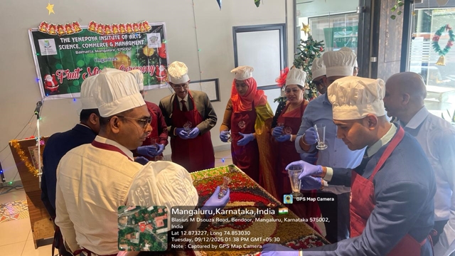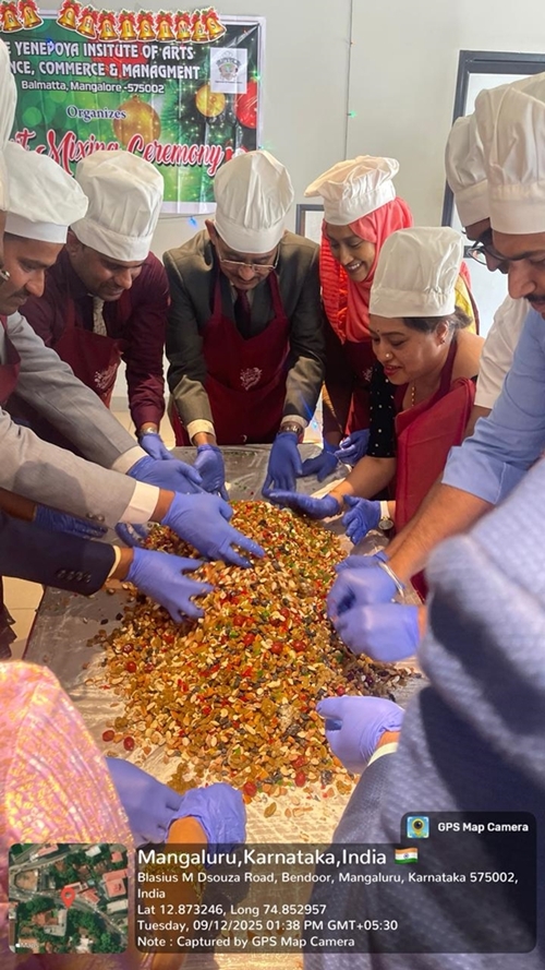 Mangaluru, Dec 11:The department of hospitality Science at the Yenepoya Institute of Arts, Science, Commerce & Management (YIASCM), Balmatta, organised its annual Christmas Fruit Mixing Ceremony on December 9 at 12:30 PM in Seminar Hall – C Block, YIASCM Balmatta Campus. The event marked the joyous beginning of the Christmas festive season while simultaneously providing students with an experiential learning opportunity rooted in global culinary traditions.