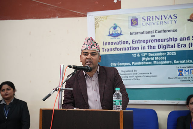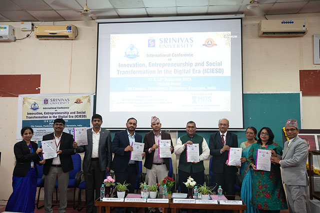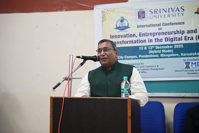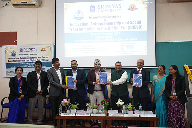 Mangaluru, Dec 12: Srinivas University, Institute of Management and Commerce (IMC), and Institute of Port, Shipping and Logistics Management (IPSLM), Department of MBA, hosted the International Conference on Innovation, Entrepreneurship and Social Transformation in the Digital Era (ICIESD – 2025) on December 12 and 13 at its City Campus (Old Building), Pandeshwar, Mangaluru.