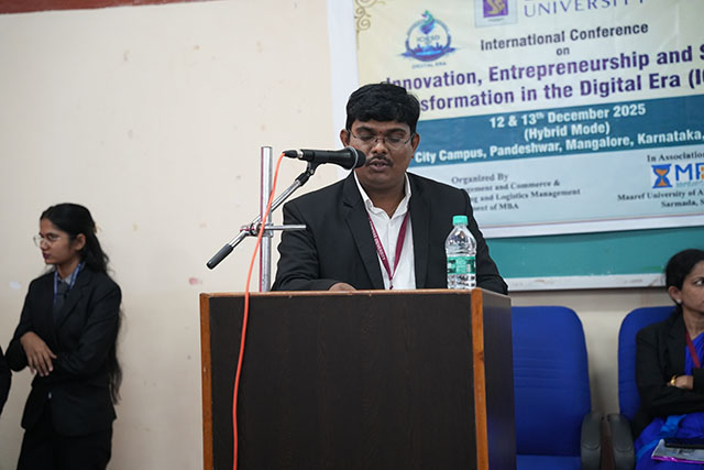 Dr Preveen B M, research director, conveyed his best wishes for the conference and appreciated the relevance of the theme in the contemporary digital landscape. He stressed that such academic platforms play a vital role in promoting high-quality research, interdisciplinary collaboration, and knowledge sharing among scholars, practitioners, and industry experts. He also commended the organizing committee for successfully bringing together participants from India and abroad.