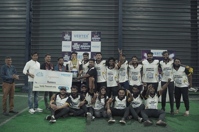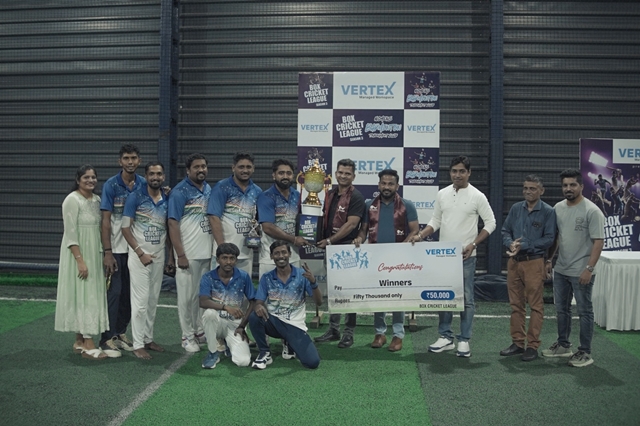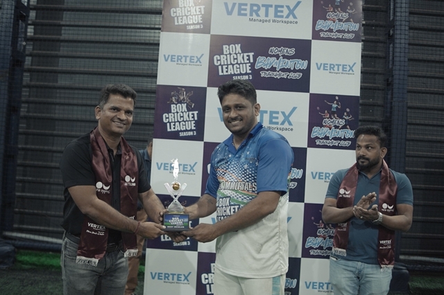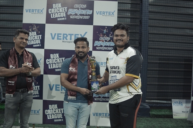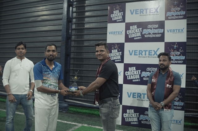 The Box Cricket League witnessed intense competition, nail-biting finishes, and high-energy performances throughout. Team Vertex Immortals, led by Prashanth Bangera from Vertex Workspace, emerged as the champions, while Team Scarlett Strikers, led by Siddharth Ballaya from Scarlett Wireless, secured the runner-up position. The Man of the Series title was won by Siddharth Ballaya from Scarlett Wireless for his consistent and impactful performance. Best Batsman was awarded to Sathim Hegde & Best Bowler was awarded to Steevan Clarence Noronha.