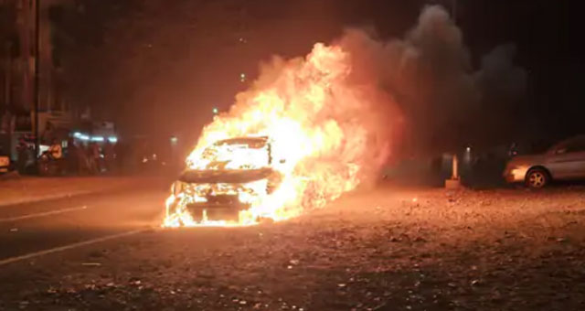 Though no casualties were reported in the incident, the fire caused significant damage to the vehicle. The sudden blaze led to brief chaos and fear among people in the vicinity. Police and local authorities are investigating the exact cause of the fire.